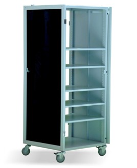Armário móvel para equipamentos de videocirurgia, com porta frontal em Policarbonato Fumê, indicado para monitores de grau médico de até 22″.